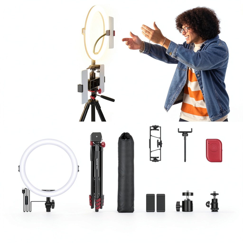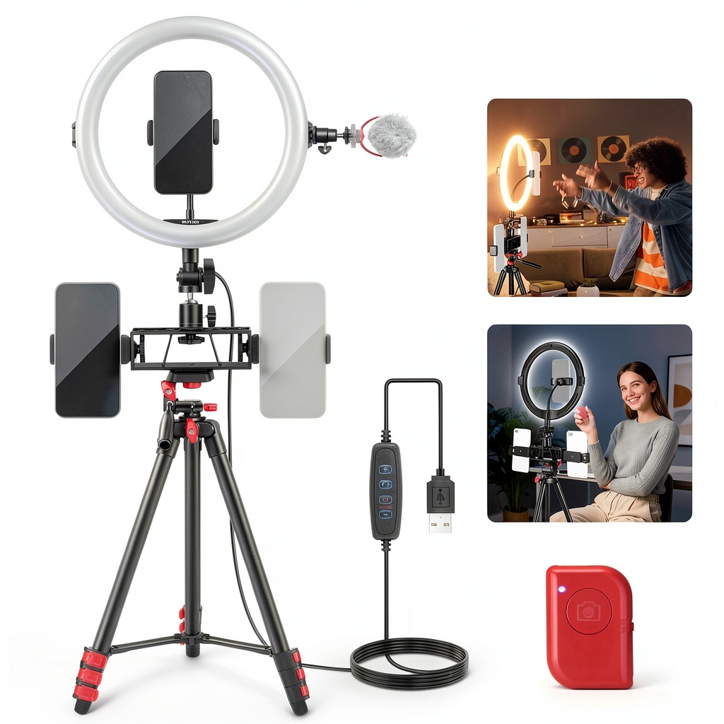 This ring light is ideal for content creators, makeup artists, and streamers on platforms like YouTube, TikTok, and Instagram. Use it for live streaming, vlogging, video calls, and studio photography to achieve even, flattering lighting. The adjustable tripod and multiple phone holders allow for multi-angle shooting, making it perfect for home studios, on-the-go filming, and professional setups where consistent light is crucial.