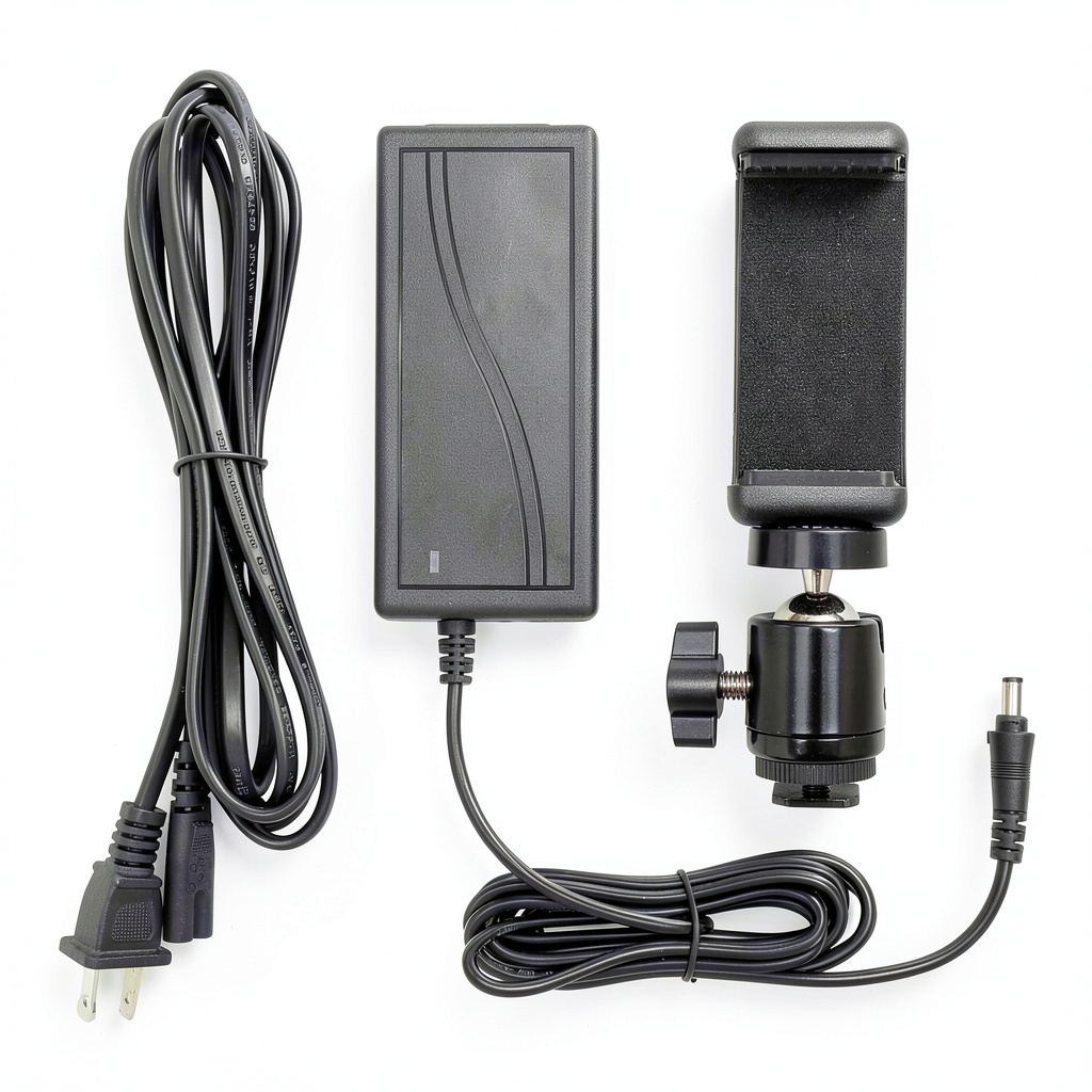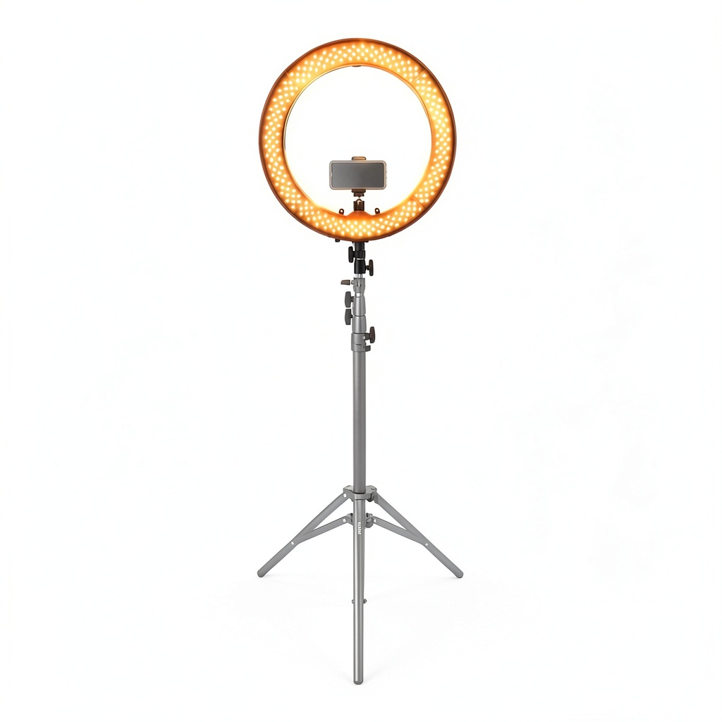 The ring light operates on standard AC power and includes a compatible power adapter for easy plug-in use.
