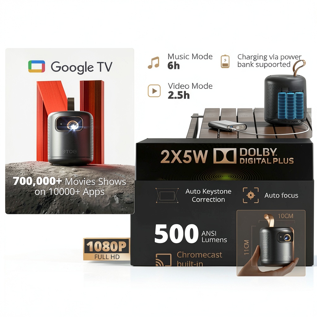The ETOE Dolphin 1080P mini projector combines advanced DLP technology with a compact, can-shaped design for exceptional portability and performance. It features 500 ANSI lumens brightness and 1080P resolution, projecting sharp, vibrant images on screens from 40 to 150 inches. Built with a 10000mAh battery supporting Type-C fast charging, it provides up to 2.5 hours of playback. Integrated Google TV grants access to over 8,000 apps, while dual 5W Dolby Audio speakers and 23 dB ultra-quiet operation ensure an immersive, undisturbed experience. This projector includes a carrying strap, remote control, and supports Bluetooth 5.1, 5G WiFi, Chromecast, AirPlay, and Miracast for versatile connectivity.