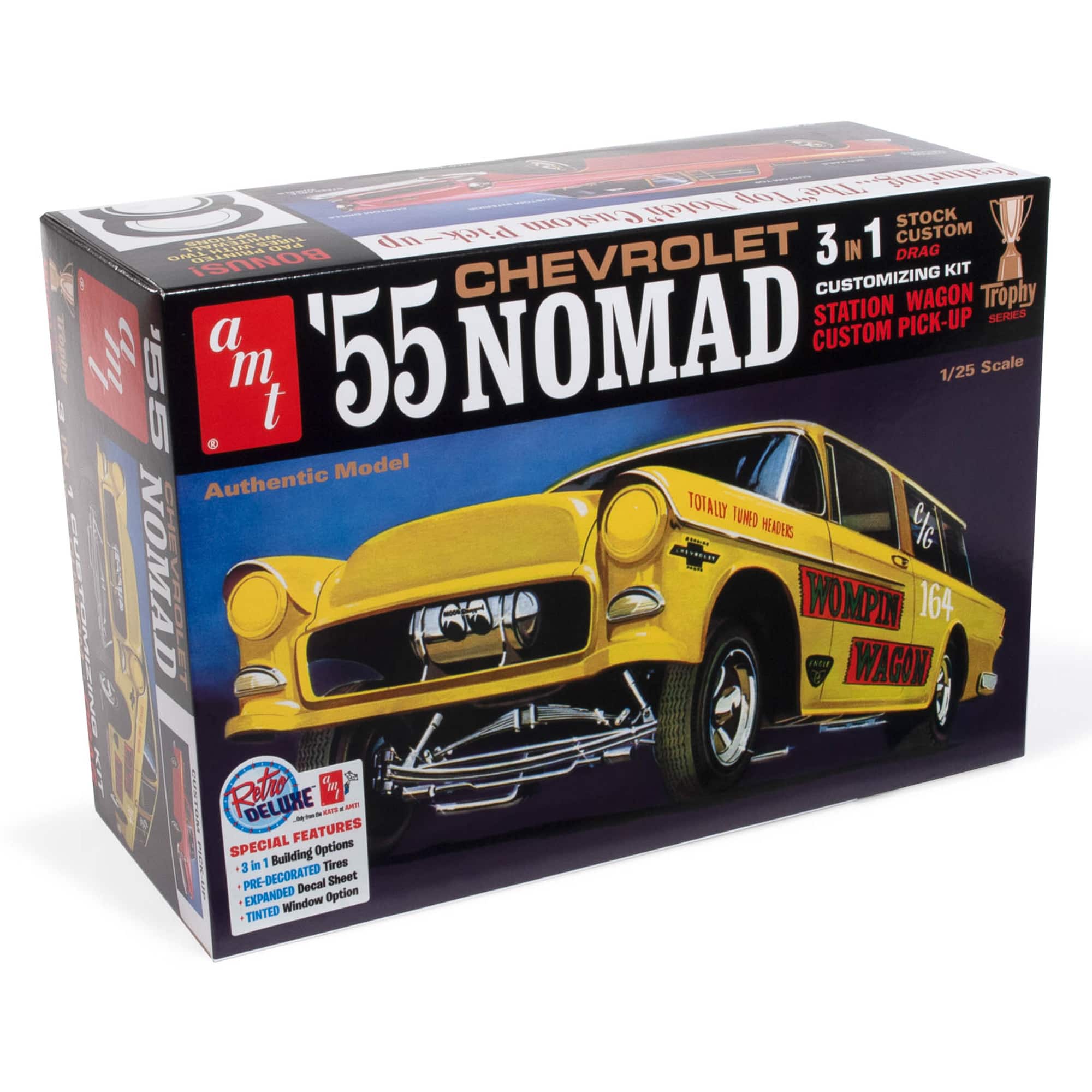 The AMT 1/25 scale 1955 Chevy Nomad model kit is a detailed replica that honors a classic era of American automotive design. This kit includes 172 parts molded in white, clear, and transparent red, with black vinyl tires and chrome-plated components. Assembled, it measures 7.5 inches long and features an expanded decal sheet for authentic detailing. Designed for Skill Level 2 builders, it requires plastic model kit paint and cement, with a paint guide included to assist in customization.