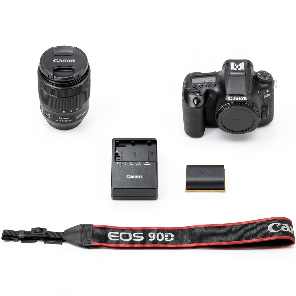 The bundle includes the Canon EOS 90D camera body, an 18-135mm lens, and necessary accessories like a battery and charger to get started right away.